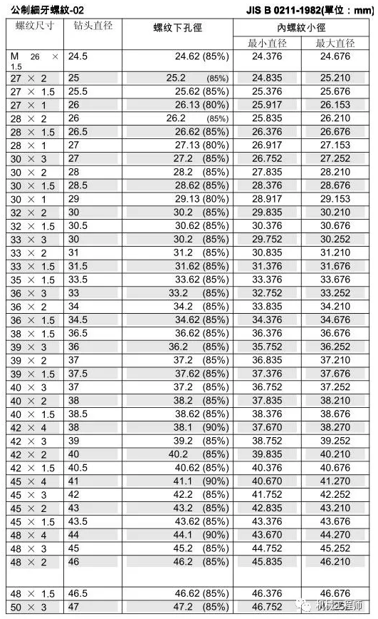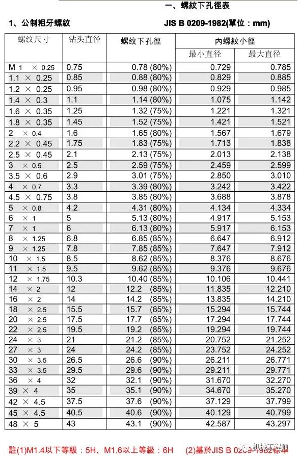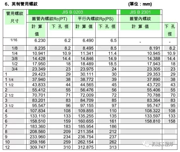 絲錐和鉆頭的參數(shù)對(duì)照表